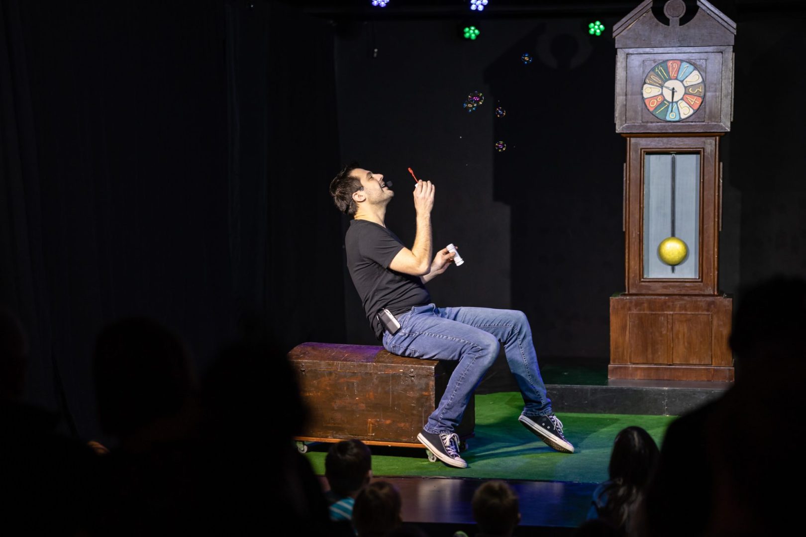 Le kdo bi lahko Cicibanu skrajšal ure, mu vrnil nasmeh na obraz in odpihnil dolgčas stran? Kdo bi lahko naredil dovolj velik milni mehurček, da bi Ciciban vanj spravil vso žalost, bolečino in samoto ter ga odpihnil daleč, daleč stran? Stopimo skupaj v svet otroške igre in milnih mehurčkov, kjer se rimani besedi, vrhunskemu pripovedništvu in simpatičnim lutkam pridružuje tudi avtorska glasba priznanega skladatelja Marjana Peternela, ki je ustvaril čudovito glasbeno podobo in uglasbil pesmice, ki jih igralec v predstavi odpoje.