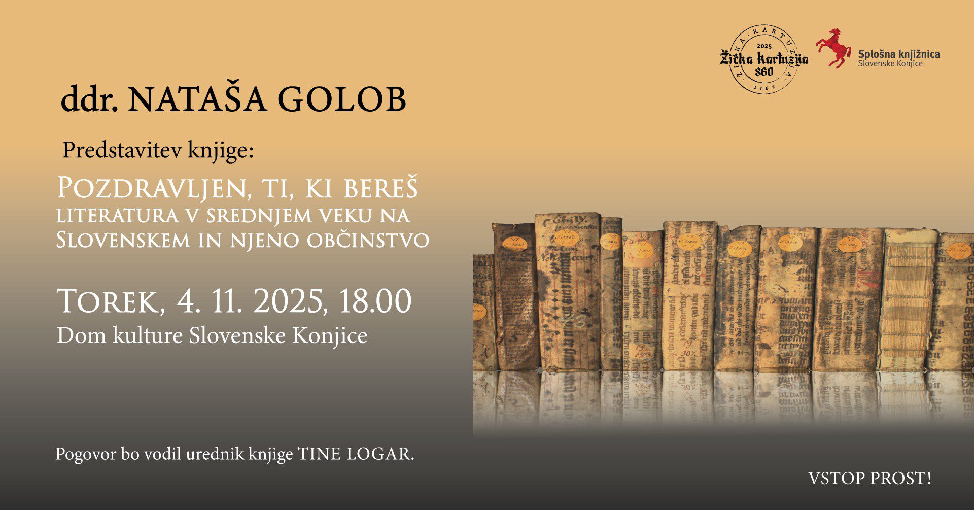Dom kulture Slovenske Konjice Mestni trg 4,Slovenske KonjiceTorek, 4. november 2025, 18.00 Dom kulture Slovenske Konjice ddr. Nataša Golob: Pozdravljen, ti, ki bereš V 𝐭𝐨𝐫𝐞𝐤, 𝟒. 𝐧𝐨𝐯𝐞𝐦𝐛𝐫𝐚, 𝐨𝐛 𝟏𝟖. 𝐮𝐫𝐢 vas vabimo v 𝐃𝐨𝐦 𝐤𝐮𝐥𝐭𝐮𝐫𝐞 𝐒𝐥𝐨𝐯𝐞𝐧𝐬𝐤𝐞 𝐊𝐨𝐧𝐣𝐢𝐜𝐞 na predstavitev nove knjige ddr. ℕ𝕒𝕥𝕒š𝕖 𝔾𝕠𝕝𝕠𝕓, priznane umetnostne zgodovinarke ter ugledne poznavalke srednjeveških rokopisov in knjižnega slikarstva, z naslovom ℙ𝕠𝕫𝕕𝕣𝕒𝕧𝕝𝕛𝕖𝕟, 𝕥𝕚, 𝕜𝕚 𝕓𝕖𝕣𝕖š: 𝕃𝕚𝕥𝕖𝕣𝕒𝕥𝕦𝕣𝕒...
